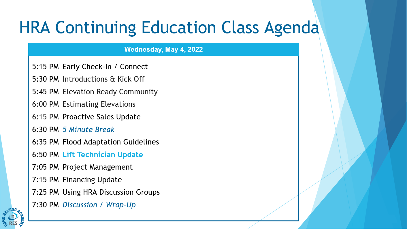 Home Raising Academy Training Videos<< Continuing Ed - May 4, 2022 >> Introductions / Elevation Ready Community Estimating Elevations Proactive Sales Update Flood Adaptation Guidelines Lift Technician Update Project Management Financing Update Using HRA Discussion Groups / Wrap-Up