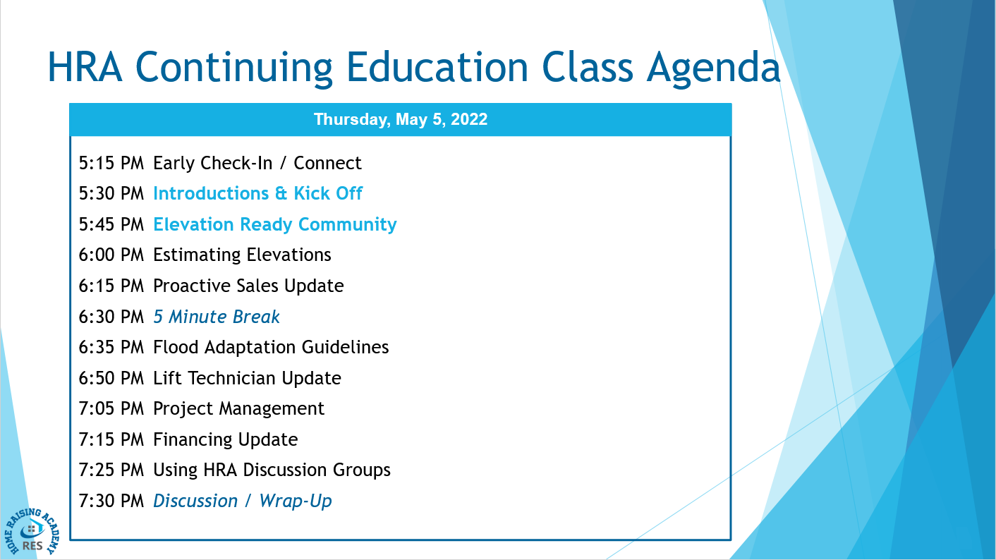 Home Raising Academy Training Videos<< Continuing Ed - May 5, 2022 >> Introductions / Elevation Ready Community Estimating Elevations Proactive Sales Update Flood Adaptation Guidelines Lift Technician Update Project Management Financing Update Using HRA Discussion Groups / Wrap-Up